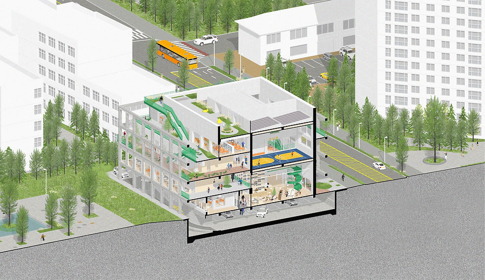 한 조사에 따르면 대한민국 청소년 삶의 만족도는 OECD 최하위이며, 성적은 최상위권이라고 한다. 여기에 청소년 173만명 중 8만명 (4.8%)이 적극적인 상담과 치료가 필요한 '관심군'이고, 당장 관심과 손길이 필요한 '자살 위험군' 청소년만 2만여명 (1.3%)에 달한다고 조사되었다. 청소년은 언제나 무엇을 즐기고, 누군가와 장난치기를 좋아하는 '유희하는 인간(HOMO LUDENS)'이다. 그러나 대한민국 청소년은 과도한 학업, 성적불안으로 인한 스트레스 속에 놓여 있으며, 그들의 본성인 '유희하는 인간'으로서 살아가는 것을 거세당하고 있다. 창의력이 중요해지는 오늘날 더더욱 세상을 바꾸는 힘은 친구들과의 '놀이', '자연'과의 접촉, 친구들과의 '대화와 유대감'을 통해 길러지며, 이것들은 청소년이 '유희하는 인간'으로서 본래 모습을 찾는 것에서 출발해야 한다. 청소년문화의집은 다양한 문화를 자발적으로 경험하고 만들어 갈 수 있는 프로그램으로 구성되어 있으며, 이 프로그램과 청소년들이 만들어가는 변주로서 '즉흥적 공간'을 제안한다. 우리가 제안하는 청소년문화의집은 청소년 프로그램을 담는 '내부공간(IN-SPACE)'과 외부와 내부를 잇는 '사잇공간(IN-BETWEEN SPACE)'이며, 이 두 공간은 연속적이면서 자율적인 행위를 유도하는 동선에 의해 통합된다. 내부공간은 규정된 프로그램을 위한 공간이며, 사잇공간은 청소년들의 자율적인 동선 - 우연히 마주치는 커뮤니티와 놀이공간이 된다. 하길문화공원 또는 하교길에서 친구들과 대화하며 걷다보면 옥상정원까지 이어지는 건축화된 프로그램 보행가로, 그 보행가로를 통해 만나는 테라스와 친구들의 놀이공간 그리고 공원 - 마을과 소통할 수 있는 공간에서 '유희적 인간'이 자랄 것이다.